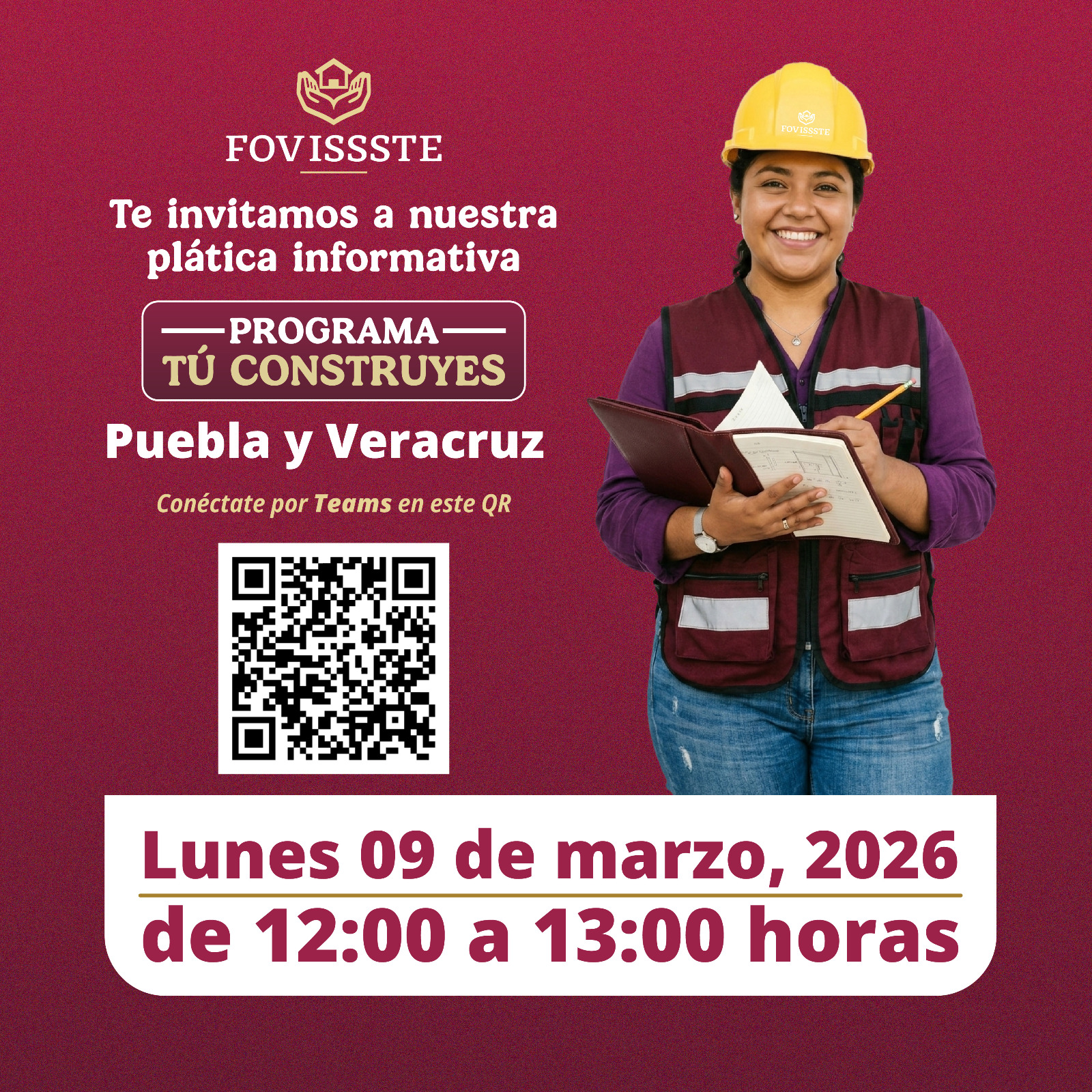 El Fondo de la Vivienda del ISSSTE (FOVISSSTE) invita a las y los derechohabientes a participar en una plática informativa sobre el programa “Tú Construyes”, dirigida a trabajadoras y trabajadores de los estados de Puebla y Veracruz.
